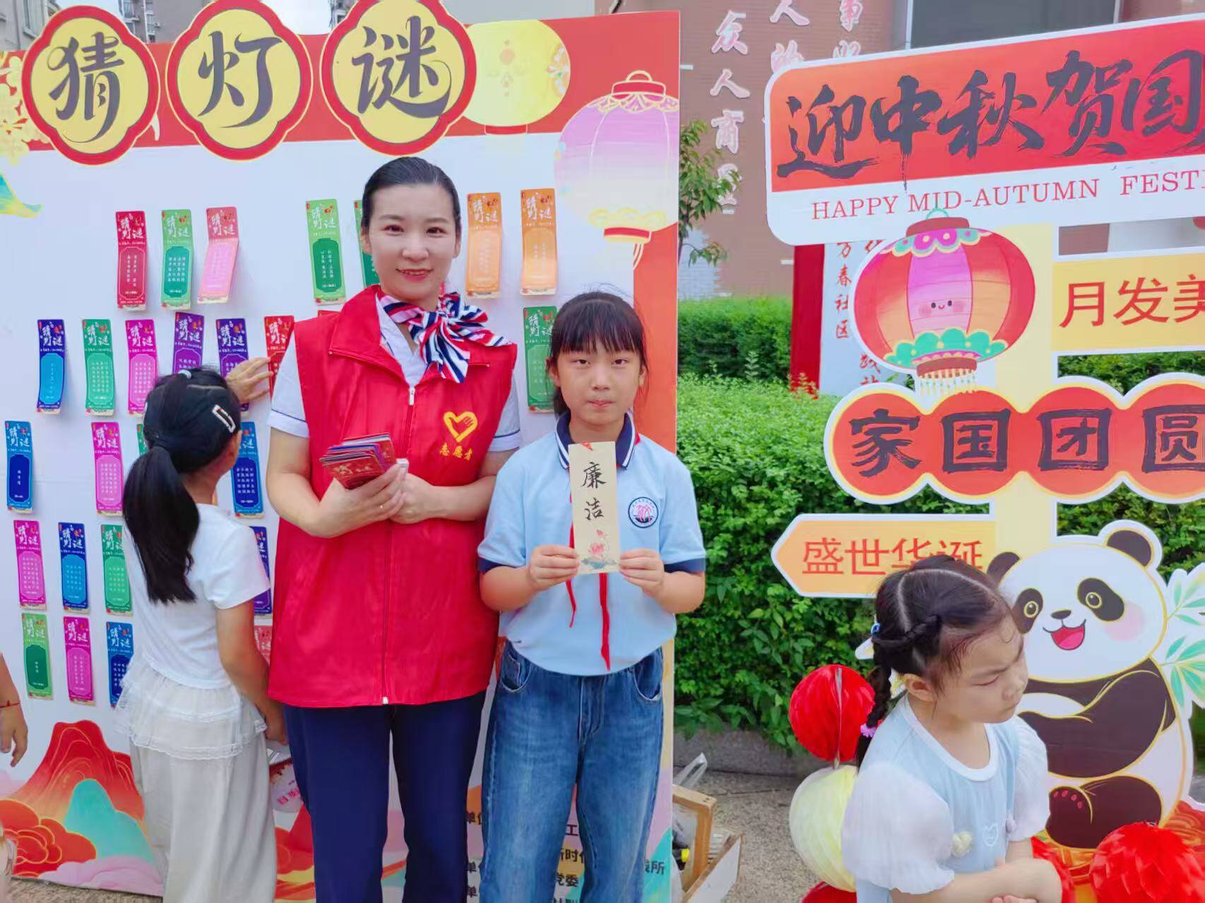 传统习俗焕新颜,文化传承显活力。中秋环节以团圆文化为纽带,通过多样化特色活动,唤醒居民对传统节日的情感认同,推动中华优秀传统文化在社区落地生根。活动现场设置中秋猜灯谜、玉兔套圈、玉兔投壶、玉兔钓花灯、后羿射日五大游戏互动区,游戏设计均融入中秋传统习俗与神话元素,兼具趣味性与文化性。中秋猜灯谜区悬挂含传统诗词、节日习俗、社区文化等内容的灯谜,居民积极参与、相互探讨,猜对后可获 “中秋福卡”;玉兔套圈、投壶等游戏参与者在指定区域内完成挑战即可赢得福卡。福卡兑换区同步开放,居民凭福卡有序兑换,在收获节日礼品的同时,深切感受中秋文化魅力。活动开场时,志愿者向入场居民发放【春启五社・万家欢颜】扇子,并引导居民打卡中秋主题人形立牌,进一步营造浓厚节日氛围。