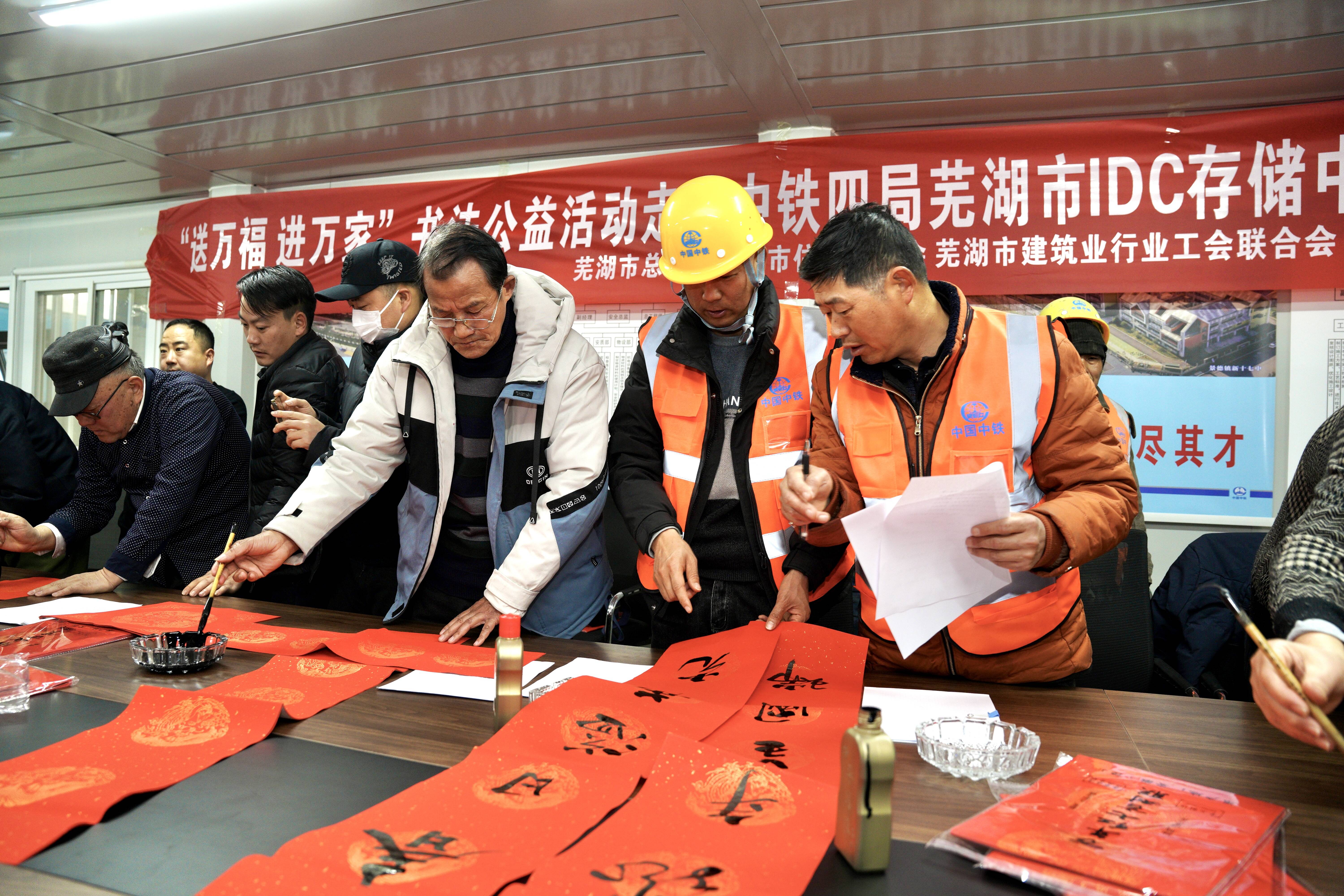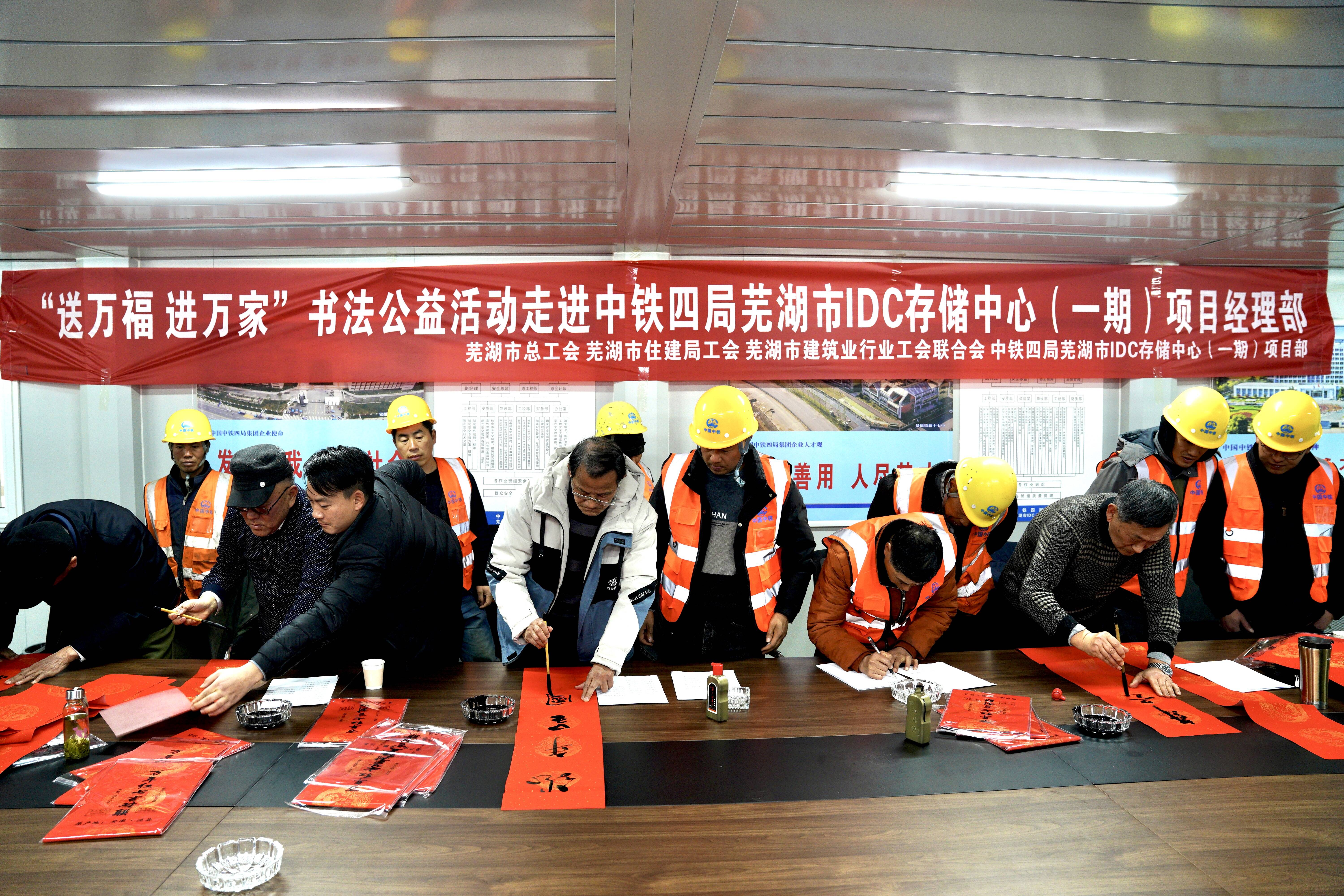 为传承中华优秀文化,营造喜庆热烈、文明祥和的节日氛围,1月26日,芜湖市总工会、市住建局工会、市建筑业行业工会联合会等单位联合走进中铁四局芜湖市IDC存储中心项目(一期),举办“送万福、进万家”书法公益活动,为一线建筑工人写春联,送祝福。