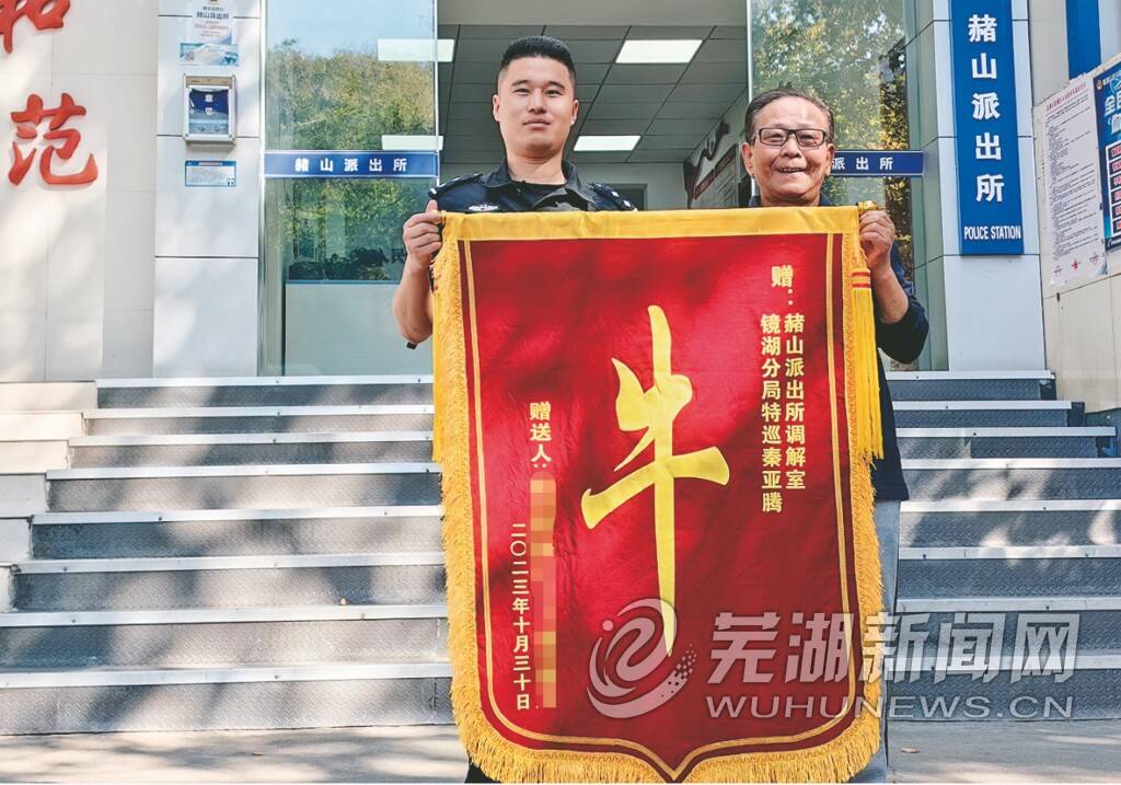 11月1日一早,记者在走访芜湖市公安局镜湖分局赭山派出所时注意到,在该所人民调解室里挂着一面锦旗,与其它锦旗不一样,这面没有对仗工整的语句,除了赠送对象与赠送人外,只有中间一个特别大的“牛”字(如图)。赠送人之一的汪女士告诉记者:“我们也不大会说话,赭山派出所民警真心诚意帮助我们解决了麻烦事,请他们吃饭又不去,我们想来想去只能夸他们真的‘牛’,太感谢他们了!”