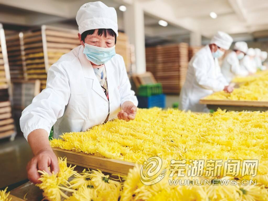 除了采摘岗位需要用人,在加工厂同样如此。当地海舜公司有比较大的菊花加工厂。记者在其中看到,约有20个留守妇女穿着工作服,戴着口罩、帽子在排花。她们整理筛选从花田送来的鲜菊花,筛选后分类送入烘干房,干燥加工成可作为茶饮的干菊。这一岗位,一个加工季一个人能挣5000余元。今年64岁的蒋克玲在工位上快速排花,将朵型好的花留下,较小或花蕊残缺的筛除,边操作边和记者交谈,“估计今年能挣到5000多块。公司提供的午饭也不错,有荤有素有汤”。