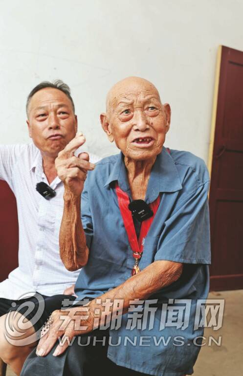 梁为仁老人(右)和小儿子梁建辉(左)在讲述抗战故事。 湘潭日报社全媒体记者 李新辉 摄
