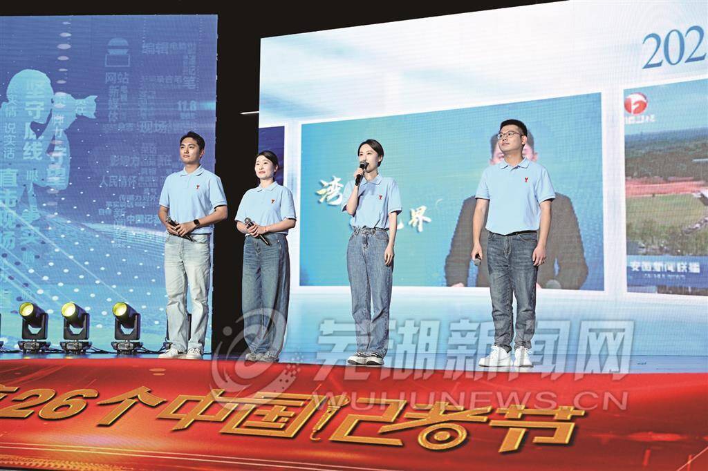 11月7日,在第26个中国记者节来临之际,芜湖传媒中心演播大厅内灯光璀璨,气氛热烈。“致敬奔跑中的时代追光者”——芜湖市新闻工作者协会庆祝记者节活动在此举行,来自全市新闻战线的采编人员代表齐聚一堂,从幕后走到台前,把镜头对准自己,共同庆祝属于自己的节日。