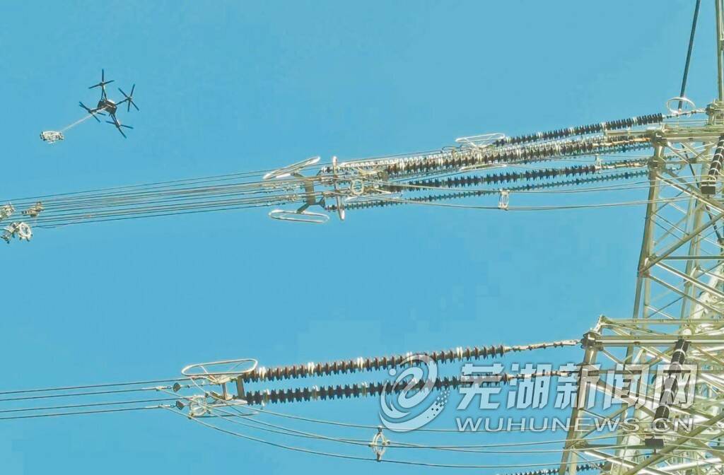 11月25日,繁昌区荻港镇境内的“甘电入浙”工程输电塔旁,无人机来回穿梭配送工程用零部件,大幅提高线路安装作业效率。
