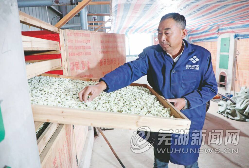 强昌标的家庭农场里,三台烘干机“嗡嗡”作响,一屉屉新采收的贡菊,在机器里轮换着位置被烘干。“平均7斤鲜花能烘出一斤干花,这几台机器24小时工作,一天能出120斤干花。”作为村里的种植大户,强昌标除了种500多亩水稻和50亩火龙果外,几年前他开始了贡菊种植。“村里的贡菊苗都是从黄山市引进的,产出的菊花品质较好,我今年种了45亩。”强昌标说,烘干的菊花,基本不愁销路,今年的收购价虽比往年低,但也保持在30多元一斤。经过几年实践,强昌标的贡菊种植技术日益成熟。菊花收完后,他还计划种植冬小麦,实现“一田多收”。