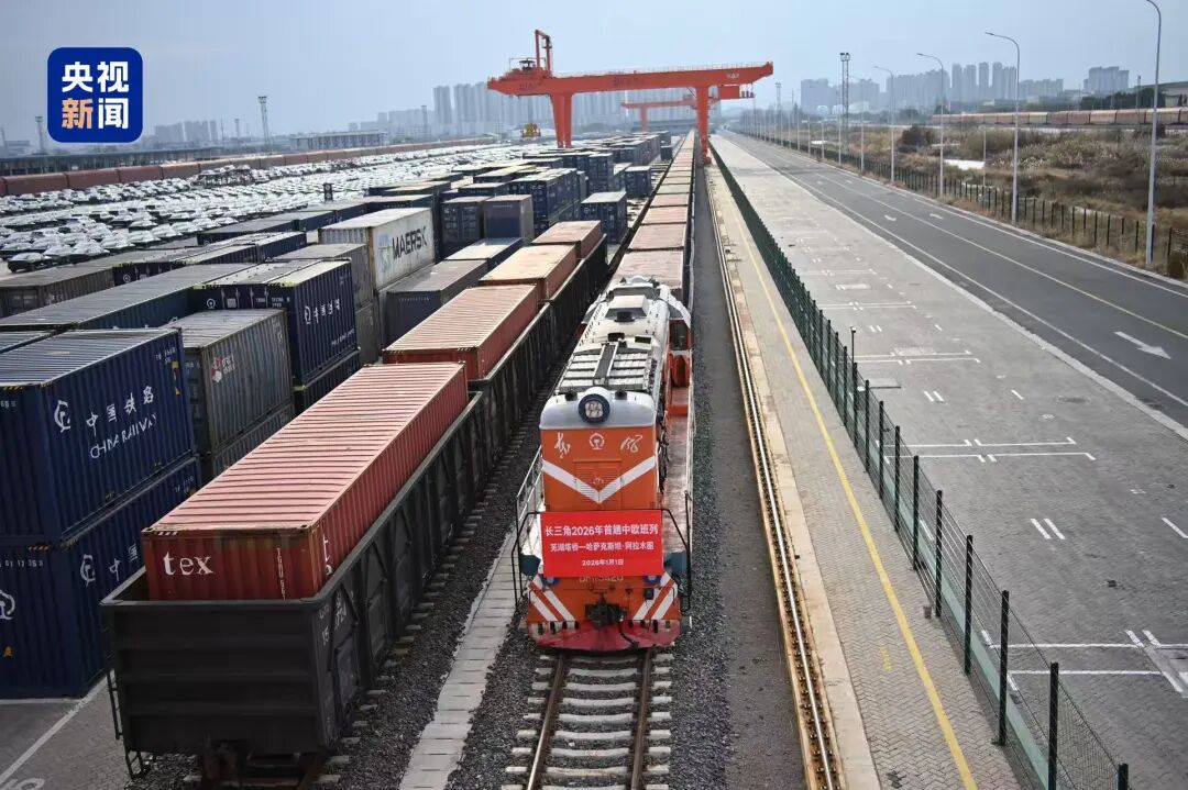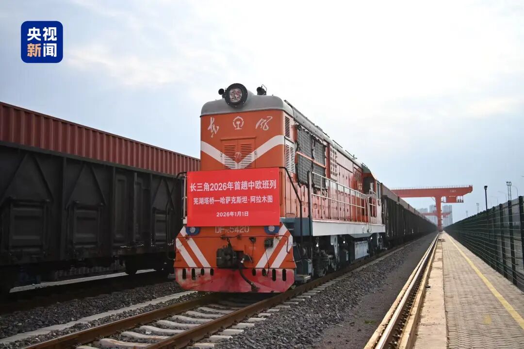 1月1日凌晨,一趟载有108个标箱汽车零配件等出口货物的中欧(亚)班列从安徽芜湖塔桥多式联运基地开出,班列将经霍尔果斯口岸出境,前往哈萨克斯坦阿拉木图,这也是2026年长三角地区开出的首趟中欧(亚)班列。